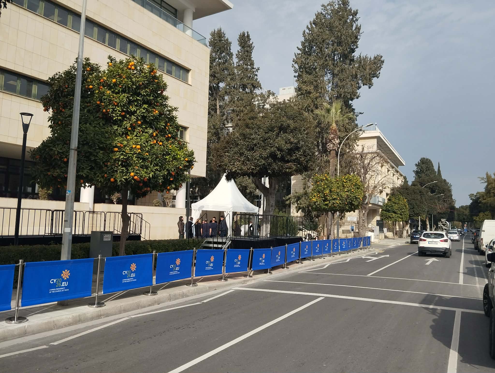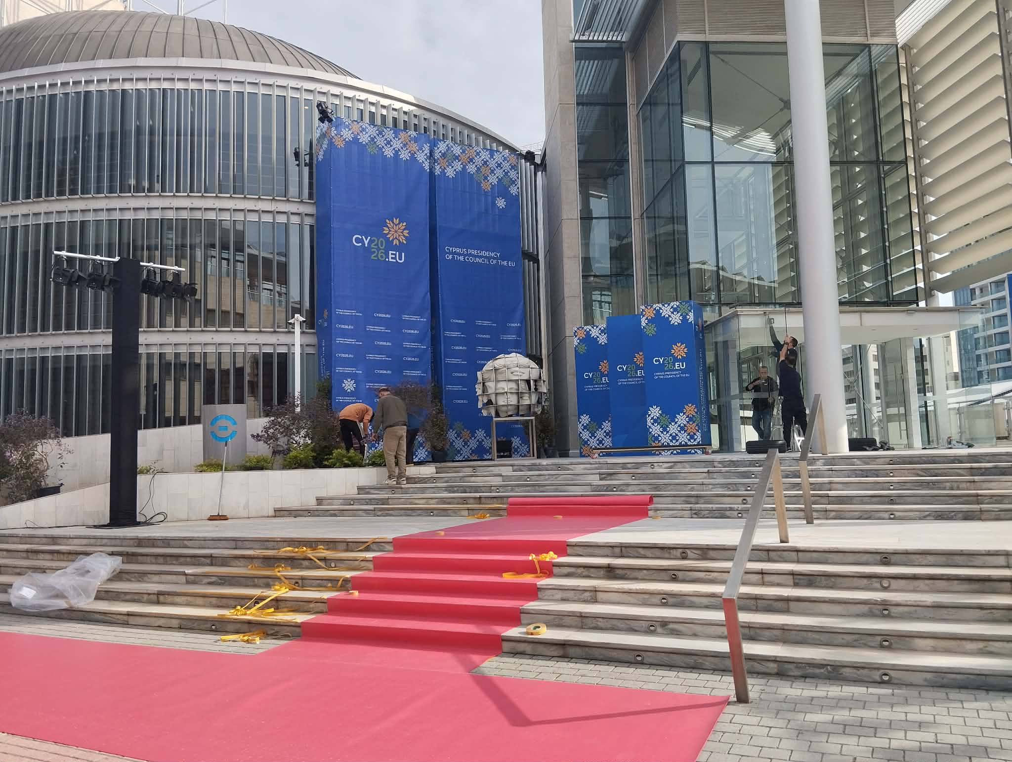 Σε πλήρη εξέλιξη βρίσκονται από το πρωί οι προετοιμασίες γύρω από το κτήριο του Θεατρικού Οργανισμού Κύπρου στο κέντρο της Λευκωσίας, ενόψει της αποψινής τελετής έναρξης της Κυπριακής Προεδρίας του Συμβουλίου της Ευρωπαικής Ένωσης. Παράλληλα, με αφορμή την τελετή έναρξης, ομάδα Ουκρανών πολιτών πραγματοποίησε το πρωί συγκέντρωση στην Πλατεία Ελευθερίας.
