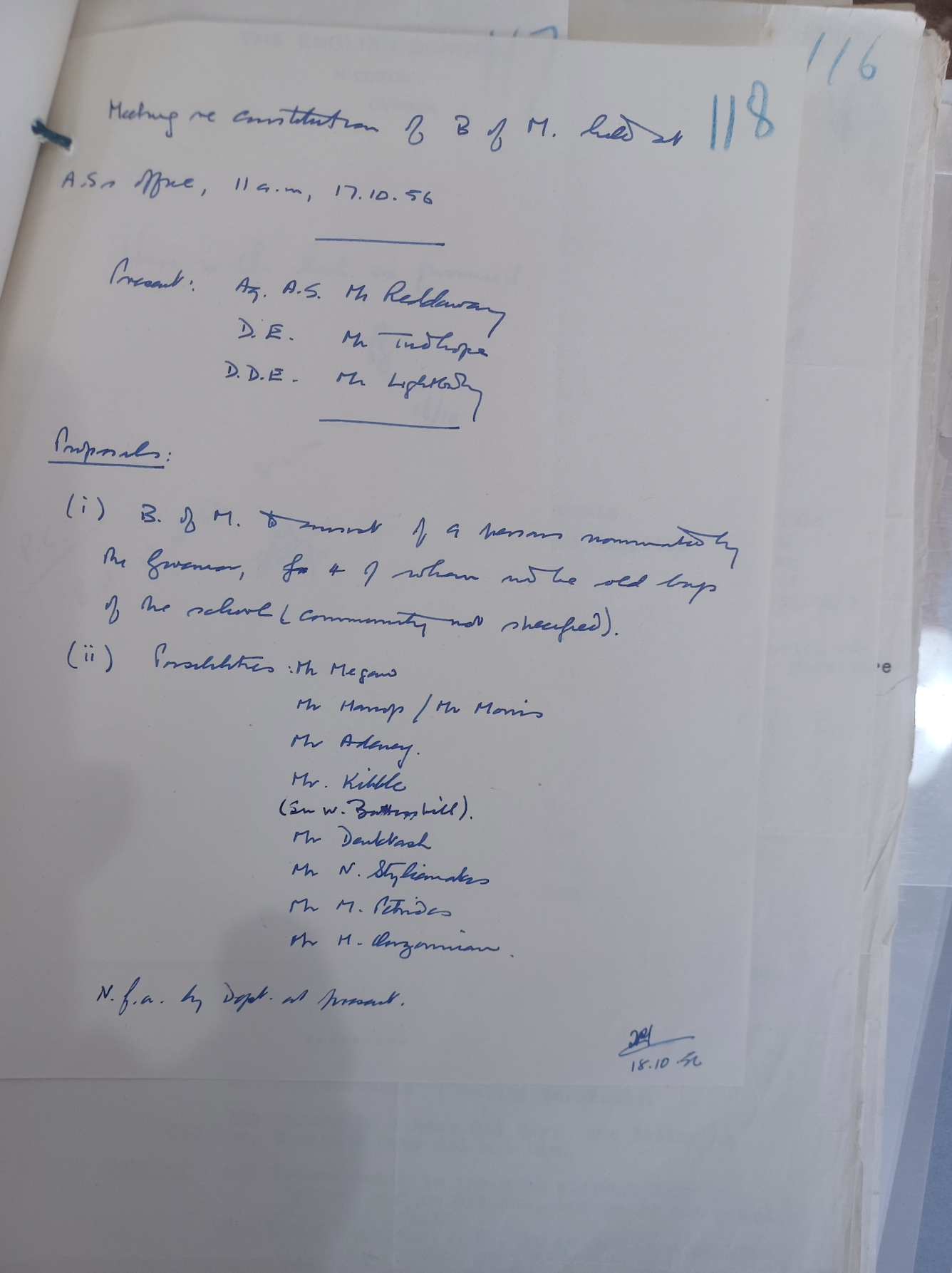 Ο διευθυντής Griffin υποβάλλει (7-3-1956) λεπτομερή, μεγαλεπήβολα και πλήρως κοστολογημένα αναπτυξιακά σχέδια για τη σχολή τα οποία πολύ σύντομα, με εξαίρεση την επέκταση του ενός οικοτροφείου, μπαίνουν στο ράφι. Ο διευθυντής Griffin πιέζει πολύ να αυξηθούν οι δαπάνες για τη σχολή χωρίς κάποιες φορές να κρύβει τον εκνευρισμό/απογοήτευσή του.