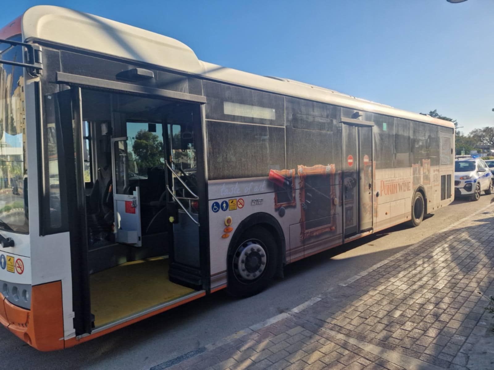 Νωρίς το απόγευμα, δύο νεαρά άτομα που επέβαιναν σε μοτοσικλέτα φέρονται να πέταξαν κροτίδα μέσα στο λεωφορείο από παράθυρο, ενώ αυτό κινείτο στην παραλιακή περιοχή της Γερμασόγειας, κοντά στο ξενοδοχείο Posidoneia.
