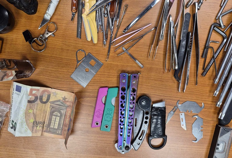 Στην κατοχή του 34χρονου τα μέλη της Αστυνομίας εντόπισαν αριθμό κοσμημάτων, όπως ασημένια σκουλαρίκια και ένα δακτυλίδι, καδένες λαιμού, σταυρούς, καθώς και ένα γυναικείο ρολόι, ενώ εντόπισαν και αριθμό τραπεζικών καρτών, στο όνομα πέντε άλλων προσώπων. Εντόπισαν επίσης στην κατοχή του 34χρονου, δύο μαχαίρια και επιθετικά όργανα, διαρρηκτικά εργαλεία, καθώς και ποσότητα κρυσταλλικής ουσίας, βάρους πέντε γραμμαρίων περίπου, που πιστεύεται ότι είναι ναρκωτικά.