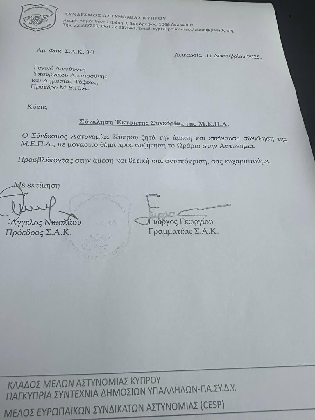 Το σχετικό αίτημα στάλθηκε σήμερα (επιστολή) από τον σύνδεσμο αστυνομίας Κύπρου προς τον πρόεδρο της μικτής επιτροπής αστυνομίας και πλέον αναμένεται η απάντηση του υπουργείου Δικαιοσύνης.