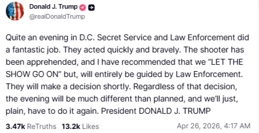 «Ήταν μια πραγματικά έντονη βραδιά στην Ουάσινγκτον. Η Μυστική Υπηρεσία και οι δυνάμεις επιβολής του νόμου έκαναν φανταστική δουλειά. Ενήργησαν γρήγορα και με θάρρος. Ο δράστης συνελήφθη και πρότεινα να “συνεχιστεί η εκδήλωση”, αλλά θα καθοδηγηθούμε πλήρως από τις αρχές επιβολής του νόμου. Θα λάβουν απόφαση σύντομα. Ανεξάρτητα από αυτή την απόφαση, η βραδιά θα είναι πολύ διαφορετική από ό,τι είχε σχεδιαστεί και απλώς θα χρειαστεί να το κάνουμε ξανά».