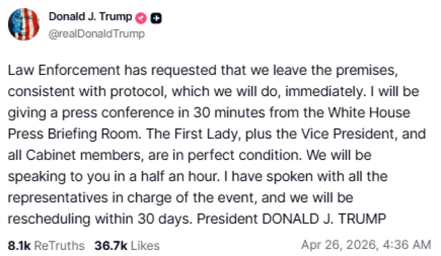 «Οι αρχές επιβολής του νόμου ζήτησαν να αποχωρήσουμε από τον χώρο, σύμφωνα με τα προβλεπόμενα πρωτόκολλα, κάτι που θα κάνουμε άμεσα. Θα παραχωρήσω συνέντευξη Τύπου σε 30 λεπτά από την αίθουσα ενημέρωσης του Λευκού Οίκου. Η Πρώτη Κυρία, καθώς και ο Αντιπρόεδρος και όλα τα μέλη του Υπουργικού Συμβουλίου, είναι απολύτως ασφαλείς. Θα σας μιλήσουμε σε μισή ώρα. Έχω ήδη επικοινωνήσει με όλους τους υπεύθυνους της εκδήλωσης και θα την επαναπρογραμματίσουμε εντός 30 ημερών», έγραψε ο Τραμπ σε νέα του ανάρτηση στο Truth Social.
