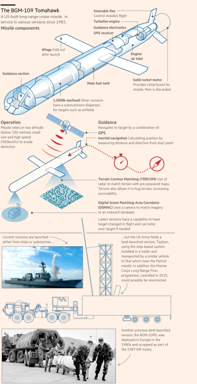 Ο Τραμπ έχει χαρακτηρίσει τον πύραυλο Tomahawk «απίστευτο» και «πολύ επιθετικό», δηλώσεις που πυροδότησαν άμεσες αντιδράσεις από τη Μόσχα και έθεσαν την ιδέα στο επίκεντρο της διπλωματίας μεταξύ Ουάσινγκτον και Κιέβου.