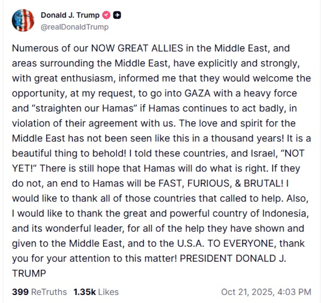 Ο Τραμπ ευχαρίστησε όλες τις χώρες που επικοινώνησαν για να προσφέρουν βοήθεια, αλλά και «τη μεγάλη και ισχυρή χώρα της Ινδονησίας και τον υπέροχο ηγέτη της για όλη τη βοήθεια που έχουν δείξει και προσφέρει στη Μέση Ανατολή και στις Ηνωμένες Πολιτείες».