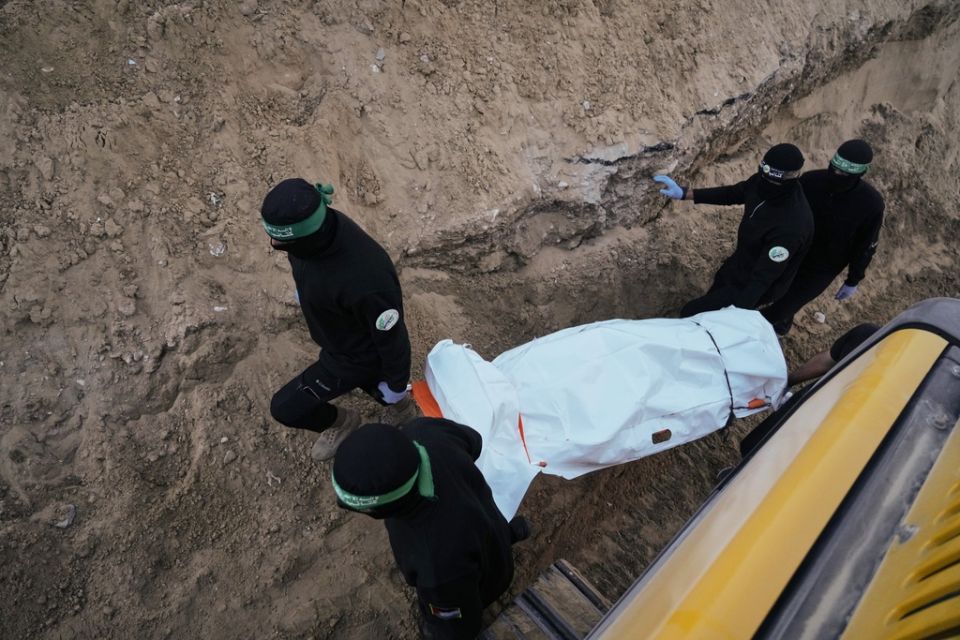 Μέλη της Χαμάς, αναζητούν σορούς των ομήρων σε τούνελ που ανακαλύφθηκε κατά τη διάρκεια ερευνών στη Γάζα. AP Photo/Jehad Alshrafi