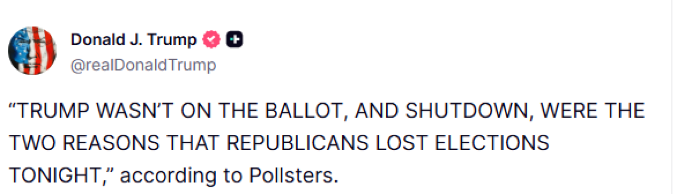 «‘Το ότι ο Τραμπ δεν ήταν στο ψηφοδέλτιο και η δημοσιονομική παράλυση (είναι) οι δυο λόγοι για τους οποίους οι ρεπουμπλικάνοι έχασαν τις εκλογές απόψε’, σύμφωνα με δημοσκόπους», ανέφερε ο αμερικανός πρόεδρος.