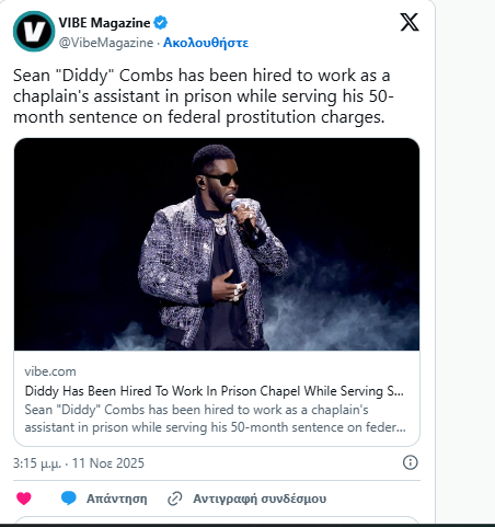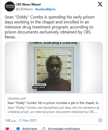 Σε πρόγραμμα απεξάρτησης από τα ναρκωτικά μέσα στη φυλακή συμμετέχει ο Σον «Ντίντι» Κομπς, ο πρώην μεγιστάνας της μουσικής βιομηχανίας, σύμφωνα με τον εκπρόσωπό του, Τζούντα Ένγκελμαγερ, και το NBC.