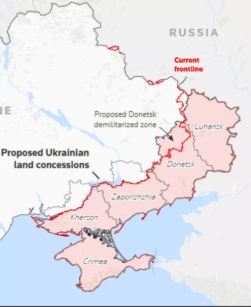 Προηγούμενες προτάσεις των ΗΠΑ ζητούσαν από την Ουκρανία να παραδώσει την περιοχή, ώστε να μετατραπεί σε αποστρατιωτικοποιημένη ζώνη υπό ρωσική διοίκηση. Η ουκρανική πηγή δήλωσε στο CNN ότι έχει σημειωθεί «κάποια πρόοδος» στο θέμα αυτό, αλλά δεν έχουν ληφθεί αποφάσεις σχετικά με το περιεχόμενο ή τη διατύπωση επί της πρότασης.