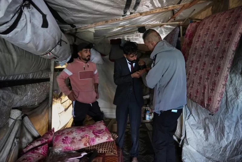 Πολλά από τα ζευγάρια μένουν σε αυτοσχέδιες σκηνές σε καταυλισμούς εκτοπισμένων γύρω από την πόλη ενώ άλλες οικογένειες ήρθαν από διάφορα σημεία του παλαιστινιακού θύλακα, παίρνοντας κομβόι ανάμεσα από συντρίμμια, ισοπεδωμένα κτίρια και μπάζα.