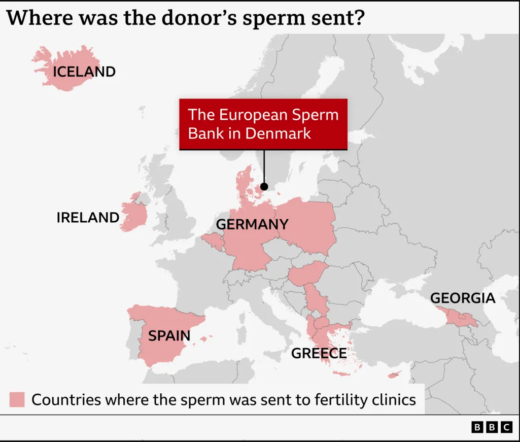 Σε ποιες χώρες δόθηκε το σπέρμα του Δανού δότη - Χάρτης του BBC