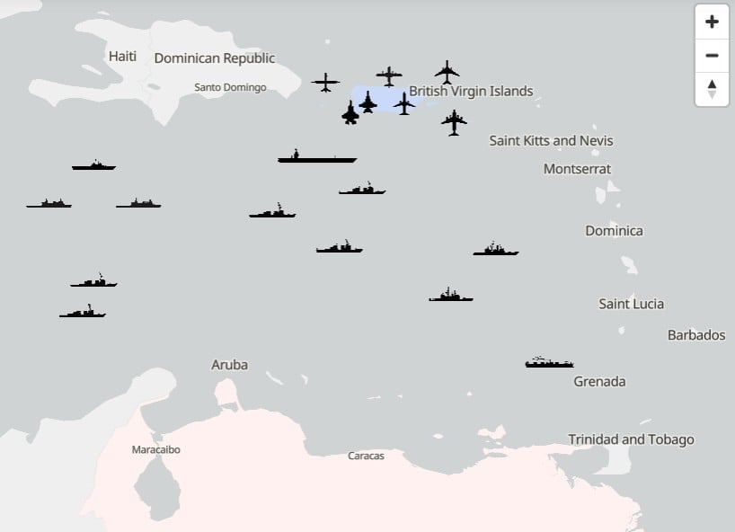 Στην περιοχή βρίσκονται, σε ένα ευρύ τόξο 50-100, περίπου 12 αμερικανικά πολεμικά πλοία ικανά να επιβάλουν ναυτική απαγόρευση. Στον πυρήνα βρίσκεται η ομάδα κρούσης του αεροπλανοφόρου USS Gerald R. Ford, που επιχειρεί στην κεντρική Καραϊβική.