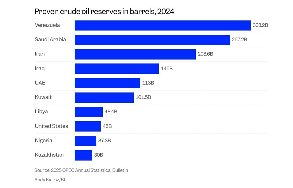 Η Βενεζουέλα διαθέτει ένα από τα μεγαλύτερα αποδεδειγμένα αποθέματα αργού πετρελαίου παγκοσμίως. Tα αποθέματά της υπολογίζονται σε 300 δισεκατομμύρια βαρέλια. Πρόκειται για τα περισσότερα από οποιαδήποτε άλλη χώρα στον κόσμο.