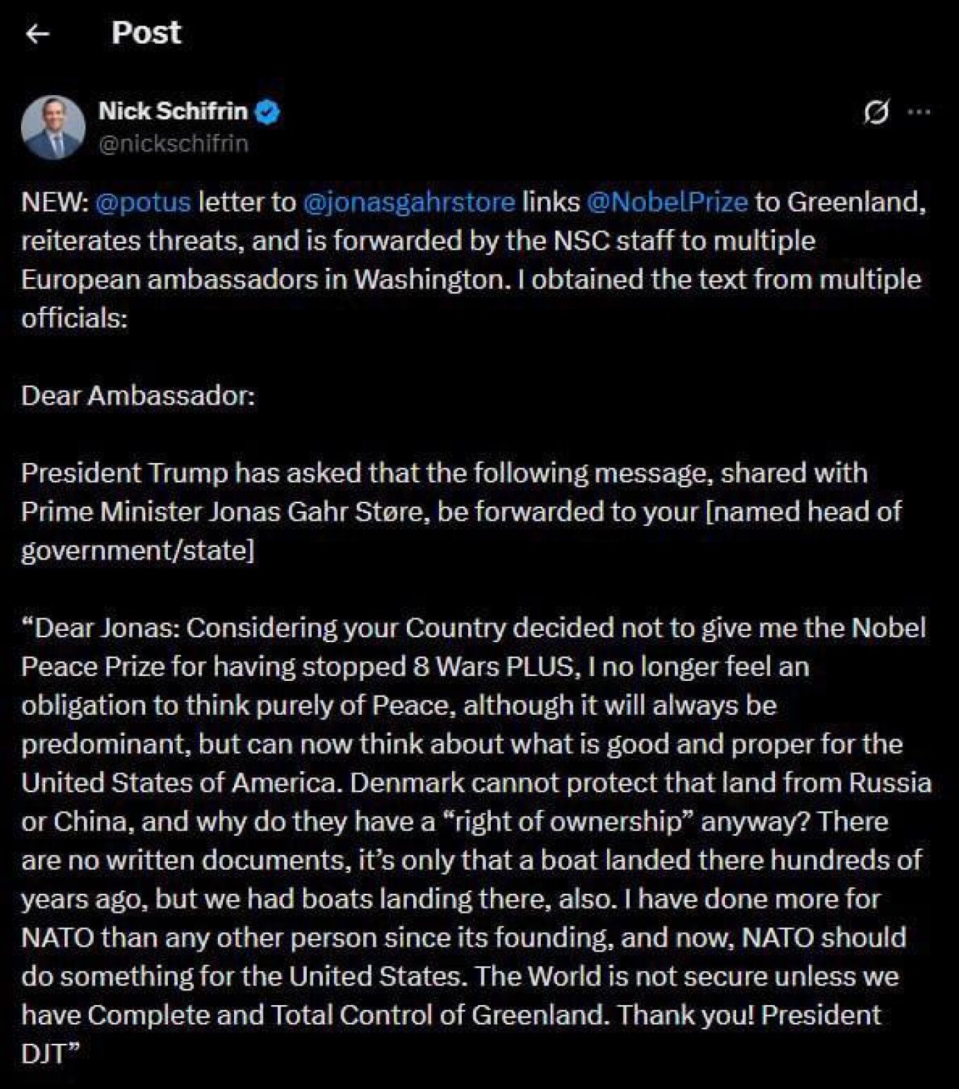 «Με δεδομένο ότι η χώρα σας αποφάσισε να μην μου δώσει το βραβείο Νόμπελ Ειρήνης αφού έβαλα τέλος σε ‘ΠΕΡΙΣΣΟΤΕΡΟΥΣ’ από 8 πολέμους, δεν νιώθω πλέον υποχρεωμένος να σκέφτομαι αποκλειστικά την ειρήνη», έγραψε ο Τραμπ σε μήνυμά του προς τον Στέρε.