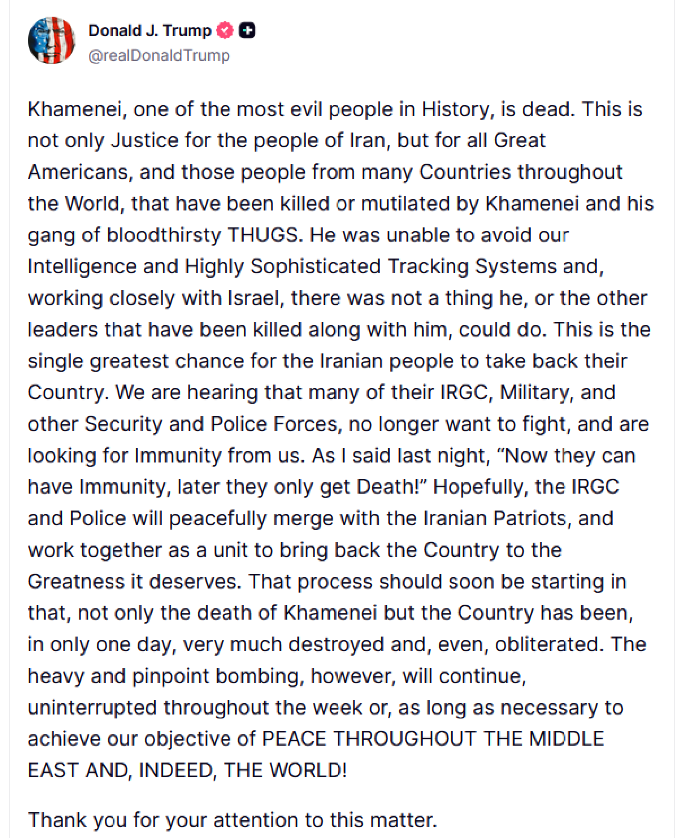 Οι φήμες οργίαζαν, μέχρι που ο Ντόναλντ Τραμπ προχώρησε σε ανακοίνωση. «Ένας από τους πιο κακούς ανθρώπους στην Ιστορία είναι νεκρός», έγραψε στο Truth Social. Σύμφωνα με τον Τραμπ, ο Χαμενεΐ εντοπίστηκε σε συνεργασία με το Ισραήλ μέσω «εξαιρετικά εξελιγμένων συστημάτων πληροφοριών». Στόχος της επιχείρησης είναι η αλλαγή καθεστώτος. Όπως είπε, είναι «η μεγαλύτερη ευκαιρία για τον ιρανικό λαό να πάρει πίσω τη χώρα του». Πρόσθεσε ότι δυνάμεις των Φρουρών της Επανάστασης και των σωμάτων ασφαλείας «δεν θέλουν πλέον να πολεμήσουν». Παράλληλα, ισραηλινοί αξιωματούχοι ανέφεραν ότι η σορός του ανακτήθηκε.