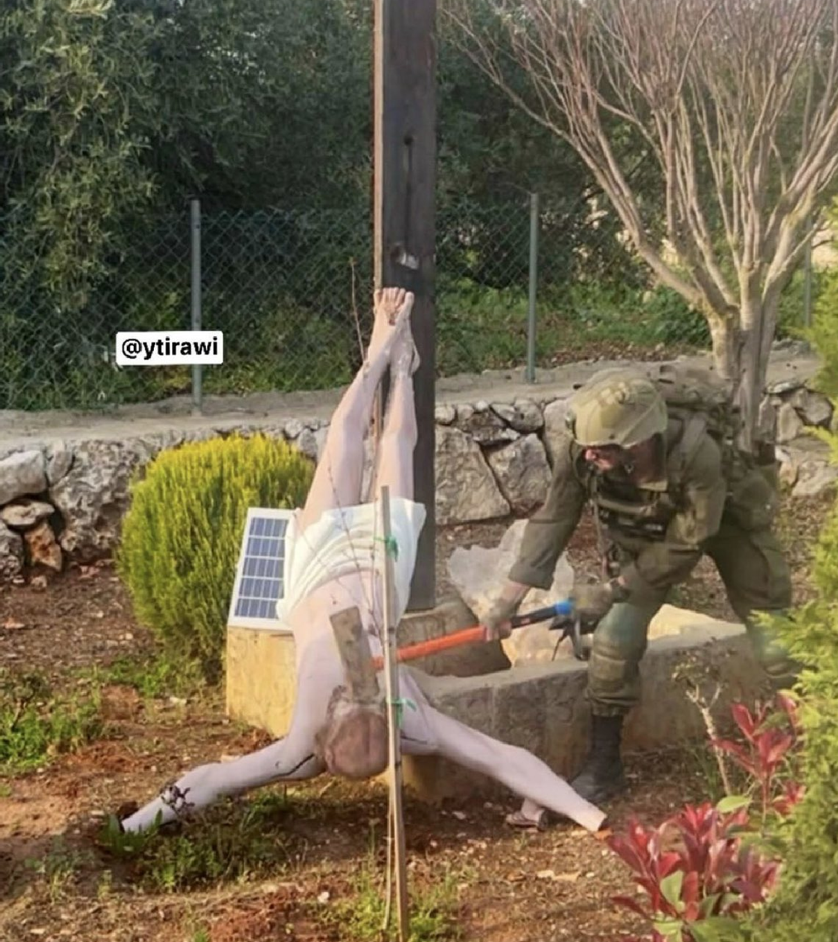 Η φωτογραφία, που τραβήχτηκε στο χριστιανικό χωριό Ντέμπελ, δείχνει τον Σταυρό του Χριστού να είναι ανάποδα στο έδαφος και έναν Ισραηλινό στρατιώτη να χτυπάει το κεφάλι του Ιησού με ένα σφυρί ή ένα τσεκούρι.
