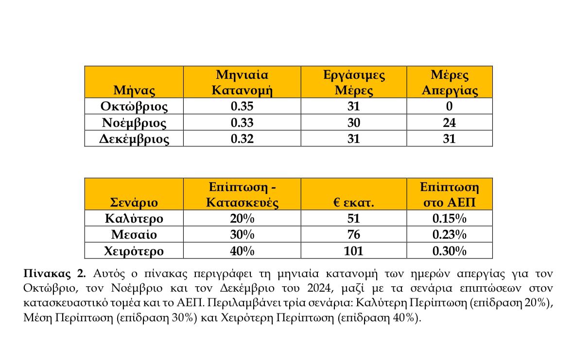 Σύμφωνα με τον Πίνακα 2, περιγράφεται η μηνιαία κατανομή των ημερών, συμπεριλαμβανομένων των ημερών απεργίας, για τους μήνες Νοέμβριο και Δεκέμβριο 2024, μαζί με τα σενάρια επιπτώσεων στον κατασκευαστικό τομέα και στο συνολικό ΑΕΠ. Κατά τον Οκτώβριο δεν έγινε απεργία, ενώ κατά τον Νοέμβριο έγιναν 24 ημέρες απεργία και για τον Δεκέμβριο αναμένονται 31 ημέρες απεργίας.