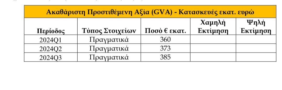 Η Ακαθάριστη Προστιθέμενη Αξία (GVA) για τον κατασκευαστικό τομέα στην Κύπρο δείχνει μια αξιοσημείωτη ανοδική τάση κατά τα πρώτα τρία τρίμηνα του 2024. Συγκεκριμένα, η GVA αυξάνεται από 360 εκατ. ευρώ το πρώτο τρίμηνο (Q1) σε 373 εκατ. ευρώ το δεύτερο τρίμηνο (Q2) και περαιτέρω σε 385 εκατ. ευρώ το τρίτο τρίμηνο (Q3).