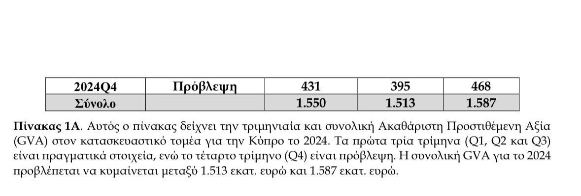Σε ετήσια βάση, η συνολική GVA για τον κατασκευαστικό τομέα το 2024 προβλέπεται να φτάσει τα 1.550 εκατ. ευρώ, υποστηριζόμενη από μια κατώτερη εκτίμηση των 1.513 εκατ. ευρώ και μια ανώτερη εκτίμηση των 1.587 εκατ. ευρώ. Αυτή η συνεπής ανάπτυξη καθ' όλη τη διάρκεια του έτους υπογραμμίζει τη σημαντική συμβολή του κατασκευαστικού τομέα στην οικονομία της Κύπρου, αντικατοπτρίζοντας τόσο την ανθεκτικότητα του τομέα όσο και τη σημασία του για τη συνολική οικονομική υγεία.