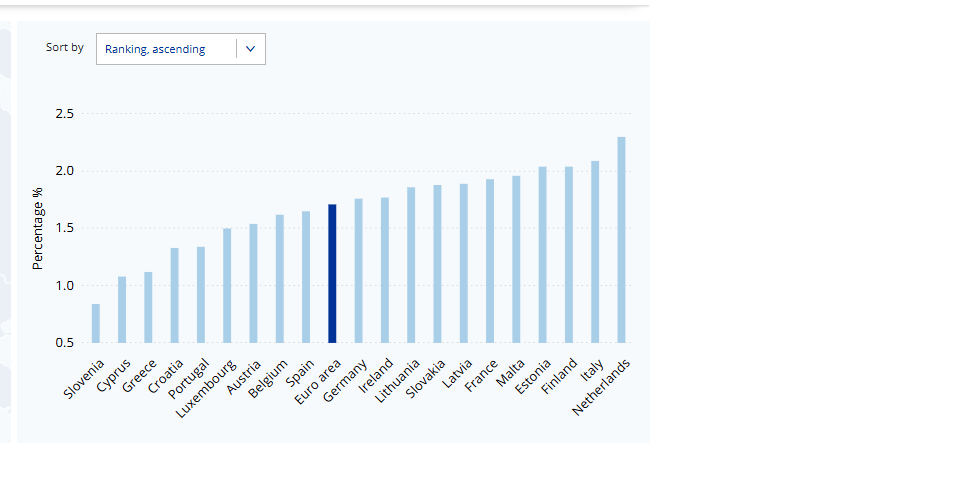 Αντίθετα, τα πιο υψηλά καταθετικά επιτόκια λαμβάνουν οι καταθέτες στην Ολλανδία (2,30%), Ιταλία (2,09%) και Φινλανδία (2,04%). Ο μέσος όρος στην ευρωζώνη είναι 1,71% από 1,72% τον Ιούλιο.