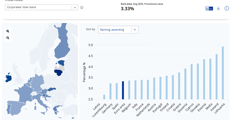 Το επιτόκιο για καταθέσεις προθεσμίας έως ενός έτους από νοικοκυριά παρέμεινε τον Αύγουστο του 2025 στο 1,08%, όσο τον προηγούμενο μήνα. Είναι το χαμηλότερο στην ευρωζώνη μετά την Σλοβενία (0,84%).