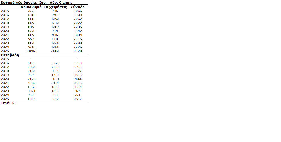 Σύμφωνα με τα νέα στοιχεία της ΚΤ, το σύνολο των δανείων που διοχέτευσαν οι τράπεζες σε νοικοκυριά και επιχειρήσεις, εκτός των αναδιαρθρώσεων, διαμορφώθηκε το οκτάμηνο του 2025 στα €3,2 δισ. από €2,3 δισ. το 2024 και €2,2 δισ. το 2019 σημειώνοντας αύξηση 39,7%.