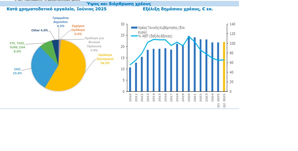 Όσον αφορά τη διάρθρωση του χρέους, το 56,5% κατανέμεται σε ομόλογα εξωτερικού, ενώ ακολουθούν τα δάνεια του Ευρωπαϊκού Μηχανισμού Σταθερότητας (ΕΜΣ) με 29,8%, ενώ το 8% είναι σε δάνεια από την Ευρωπαϊκή Τράπεζα Επενδύσεων, την Τράπεζα Αναπτύξεως του Συμβουλίου της Ευρώπης, το ταμείο SURE της ΕΕ και το Σχέδιο Ανάκαμψης και Ανθεκτικότητας.