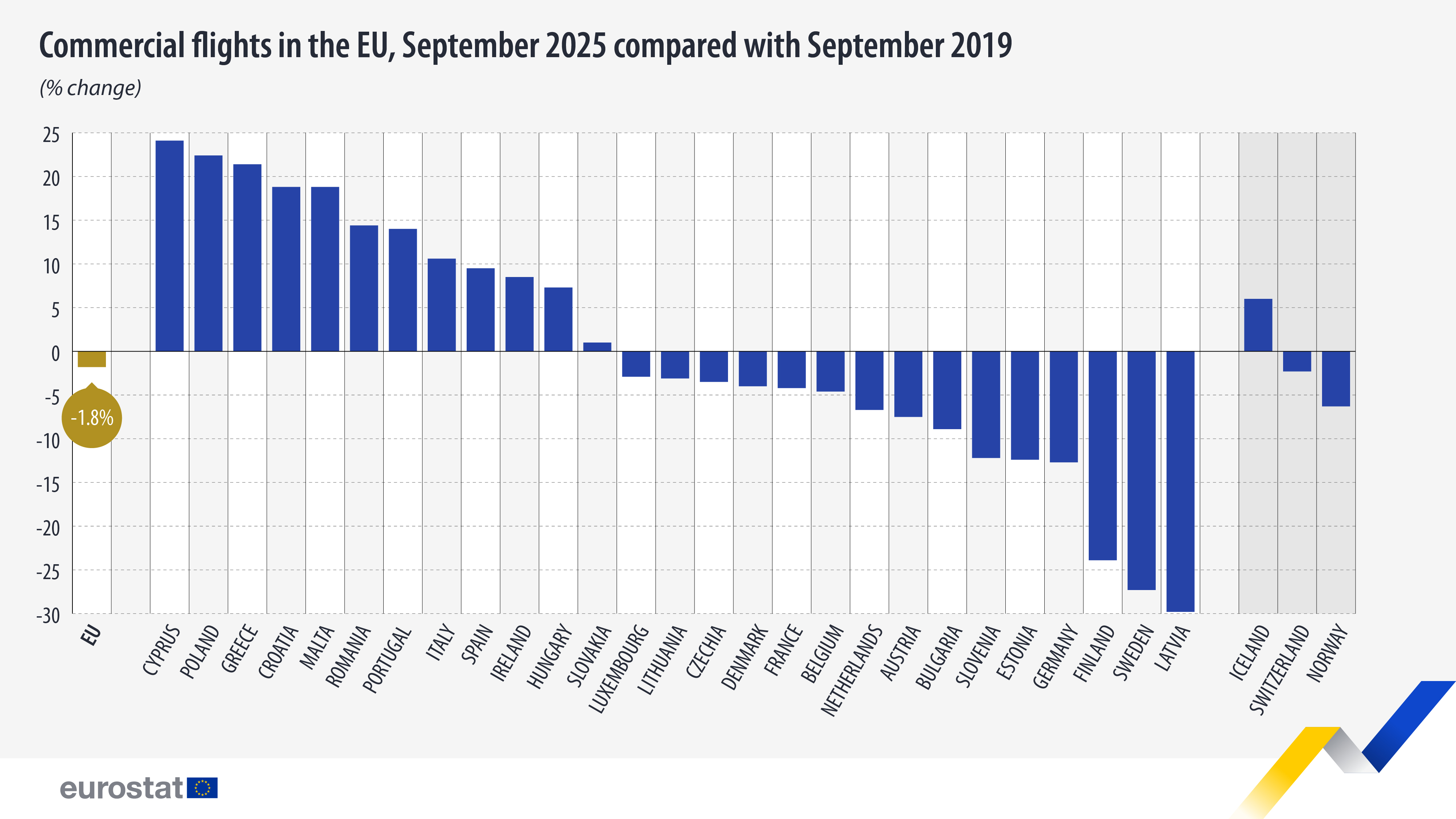 Τη μεγαλύτερη αύξηση των εμπορικών πτήσεων τον Σεπτέμβριο του 2025 σε σχέση με τον Σεπτέμβριο του 2019 στο σύνολο των κρατών μελών της ΕΕ, κατέγραψε η Κύπρος, σύμφωνα με στατιστικά δεδομένα της Eurostat.