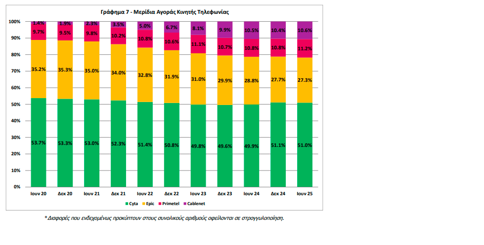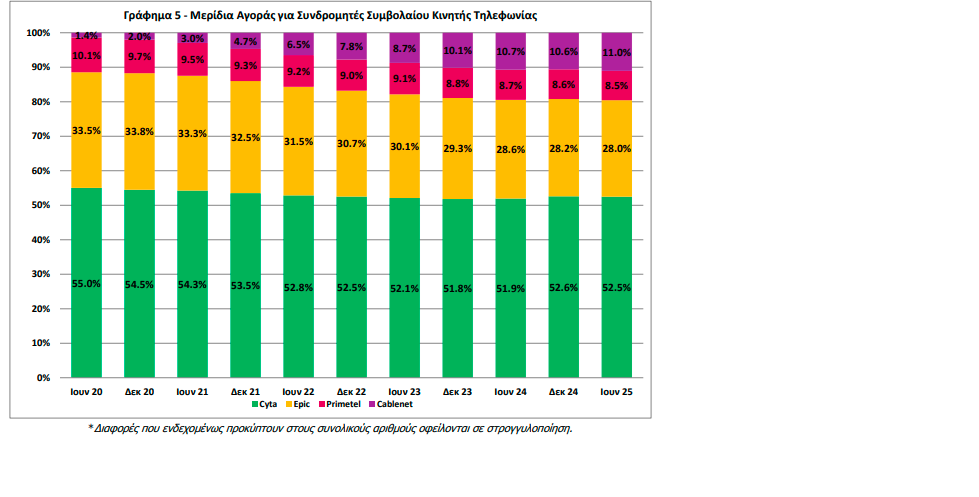 Στους συνδρομητές συμβολαίου κινητής τηλεφωνίας, το μερίδιο αγοράς της Cyta ανήλθε το εξάμηνο του 2025 στο 52,5% από 52,6% τον Δεκέμβριο του 2024.