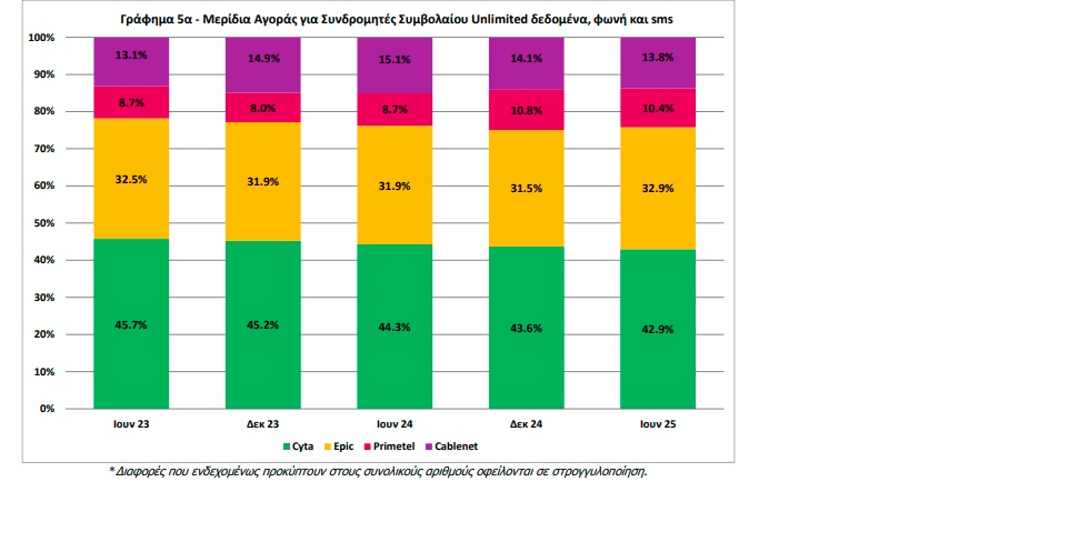Στους συνδρομητές συμβολαίου unlimited δεδομένα, φωνή και sms, το μερίδιο της Cyta είναι 42,9%, της Epic 32,9%, της Cablenet 13,8% και της Primetel 10,4%.