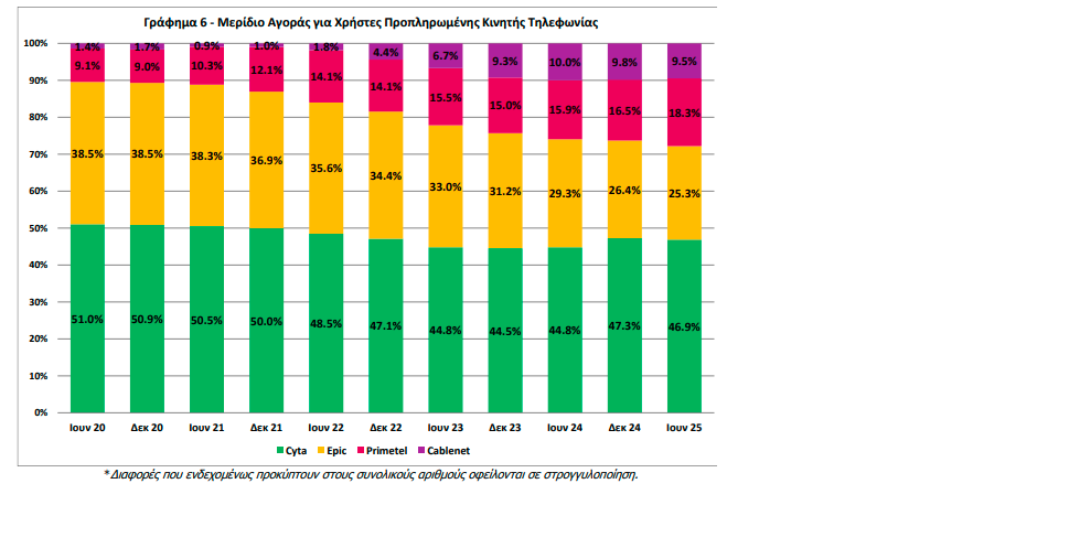 Όσον αφορά τους χρήστες προπληρωμένης κινητής τηλεφωνίας, το μερίδιο της Cyta είναι 46,9%, της Epic 25,3%, της Primetel 18,3% και της Cablenet 9,5%.