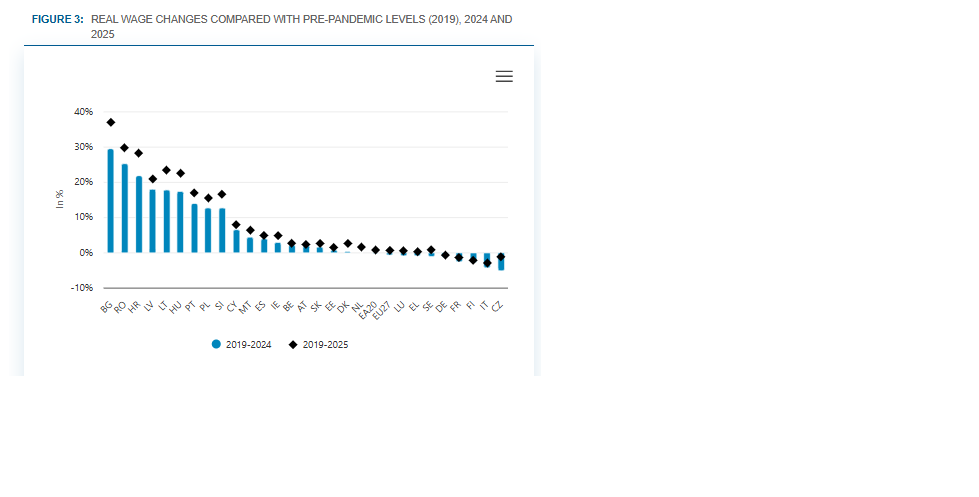 Το μέγεθος της ανάκαμψης των πραγματικών μισθών διαφέρει μεταξύ των κρατών μελών. Το 2024, οι μεγαλύτερες αυξήσεις παρατηρήθηκαν στη Ρουμανία (10,2%), την Πολωνία (9,0%) και την Ουγγαρία (8,7%), μετά από μια σημαντική επιβράδυνση το 2022-2023 σε σύγκριση με τις προηγούμενες τάσεις. Αυτό οφειλόταν τόσο στην ισχυρή αύξηση των μισθών όσο και στον επιβραδυνόμενο πληθωρισμό.