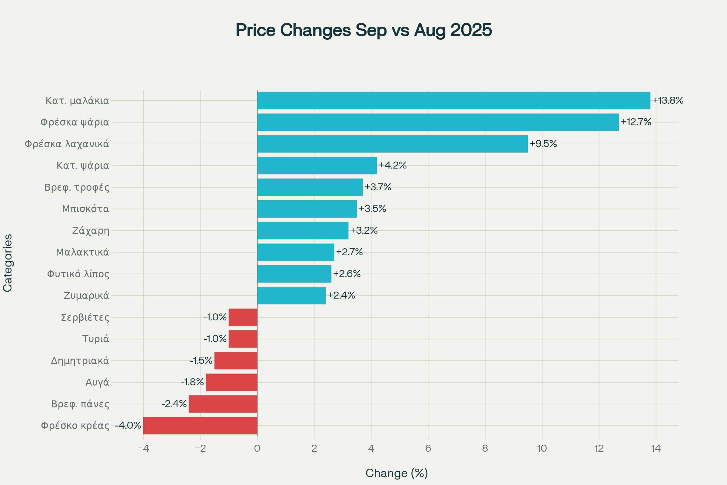 Την ίδια ώρα, αύξηση σε σχέση με τον Αύγουστο κατέγραψαν οι βρεφικές τροφές κατά 3,7% (7% έναντι Σεπτεμβρίου 2024), τα μπισκότα κατά 3,5% (0,5% έναντι Σεπτεμβρίου 2024), η ζάχαρη κατά 3,2% (-7,5% έναντι Σεπτεμβρίου 2024), τα μαλακτικά ρούχων κατά 2,7% (2,9% έναντι Σεπτεμβρίου 2024), το φυτικό μαγειρικό λίπος κατά +2,6% (-19% έναντι Σεπτεμβρίου 2024), τα ζυμαρικά κατά 2,4% (-4,2% έναντι Σεπτεμβρίου 2024).