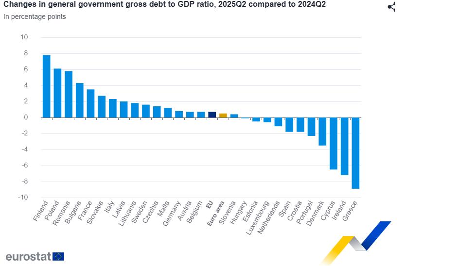 Σε σύγκριση με το πρώτο τρίμηνο του 2025, δεκαπέντε κράτη μέλη κατέγραψαν αύξηση του δείκτη χρέους προς ΑΕΠ στο τέλος του δεύτερου τριμήνου του 2025 και δώδεκα κατέγραψαν μείωση.