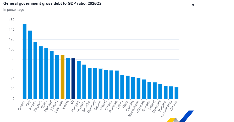 Οι υψηλότεροι δείκτες δημόσιου χρέους προς ΑΕΠ στο τέλος του δεύτερου τριμήνου του 2025 καταγράφηκαν στην Ελλάδα (151,2%), την Ιταλία (138,3%), τη Γαλλία (115,8%), το Βέλγιο (106,2%) και την Ισπανία (103,4%), ενώ οι χαμηλότεροι καταγράφηκαν στην Εσθονία (23,2%), το Λουξεμβούργο (25,1%), τη Βουλγαρία (26,3%) και τη Δανία (29,7%).