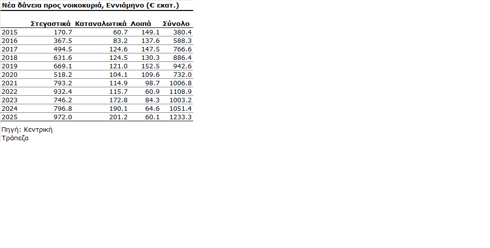 Τα συνολικά νέα δάνεια προς νοικοκυριά παρουσίασαν αύξηση 17,3% φθάνοντας στο €1,2 δισ. από €1,1 δισ. το εννιάμηνο του 2024, ξεπερνώντας κατά 11,2% το προηγούμενο ρεκόρ του 2022.