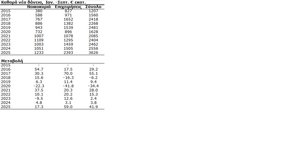 Όσον αφορά τα συνολικά νέα δάνεια που έδωσαν οι τράπεζες το εννιάμηνο του 2025 ανήλθαν στα €3,6 δισ. από €2,6 δισ. το εννιάμηνο του 2024 σημειώνοντας αύξηση 41,9%.