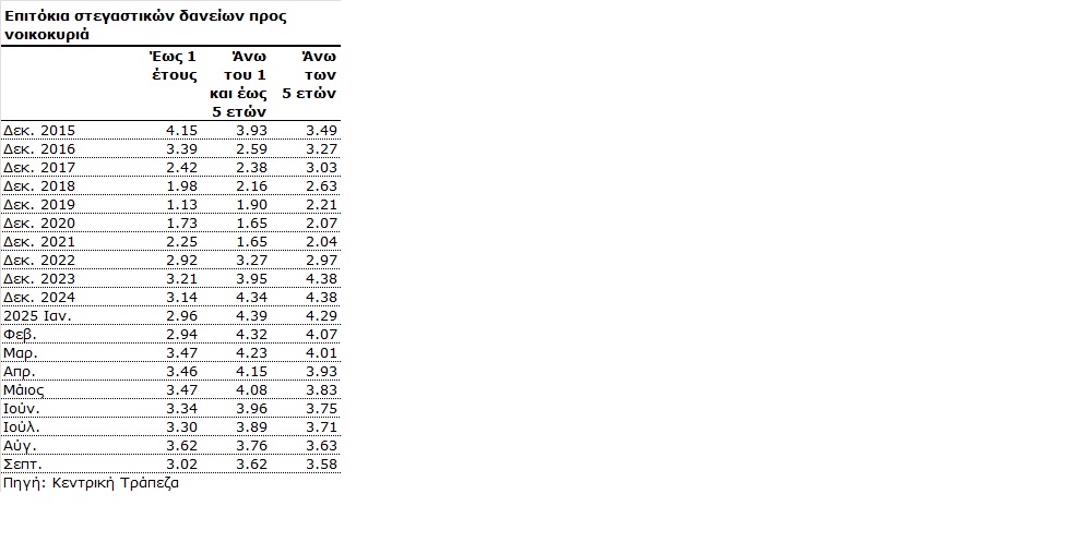 Όσον αφορά τα επιτόκια για στεγαστικά δάνεια πέραν των 5 ετών παρουσιάζουν σημαντική μείωση τους τελευταίους μήνες. Μειώθηκαν στο 3,58% τον Σεπτέμβριο από 3,63% τον Αύγουστο και 4,38% τον Δεκέμβριο του 2024.