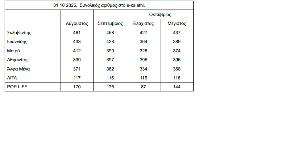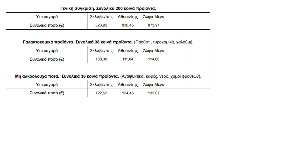 Από τους 478 κωδικούς προϊόντων που περιλαμβάνονται στο e-kalathi, στις 31 Οκτωβρίου 2025 εντοπίστηκαν συνολικά 200 κοινοί κωδικοί για τις υπεραγορές Σκλαβενίτης, Αθηαινίτης και Άλφα Μέγα. Αυτές οι υπεραγορές επιλέγηκαν καθ’ ότι διαθέτουν τα περισσότερα κοινά προϊόντα σε σύγκριση με άλλες υπεραγορές.