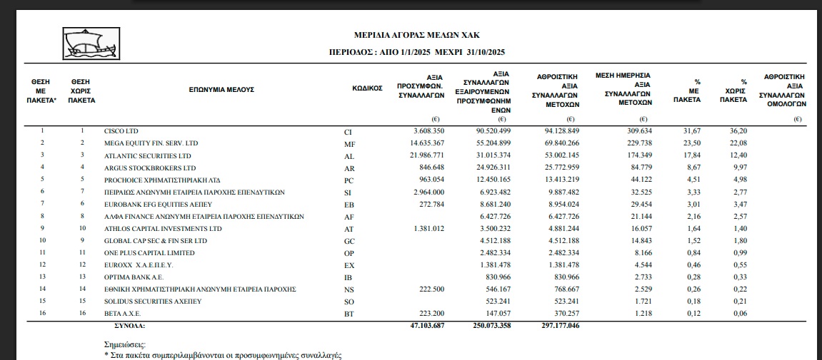 Στα €297,2 εκατ. ανήλθε τους πρώτους δέκα μήνες του 2025 η αθροιστική αξία των μετοχών που χειρίστηκαν 16 χρηματιστηριακά γραφεία, σύμφωνα με στοιχεία που δημοσίευσε την Τετάρτη το ΧΑΚ.