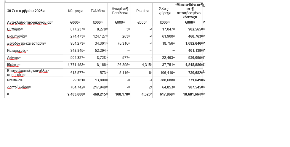 Τα μεικτά δάνεια σε μεγάλες επιχειρήσεις τέλος του Σεπτεμβρίου του 2025 ανέρχονται σε €3,6 δισ. αποτελώντας το 33,6% από 32,7% το 2024.