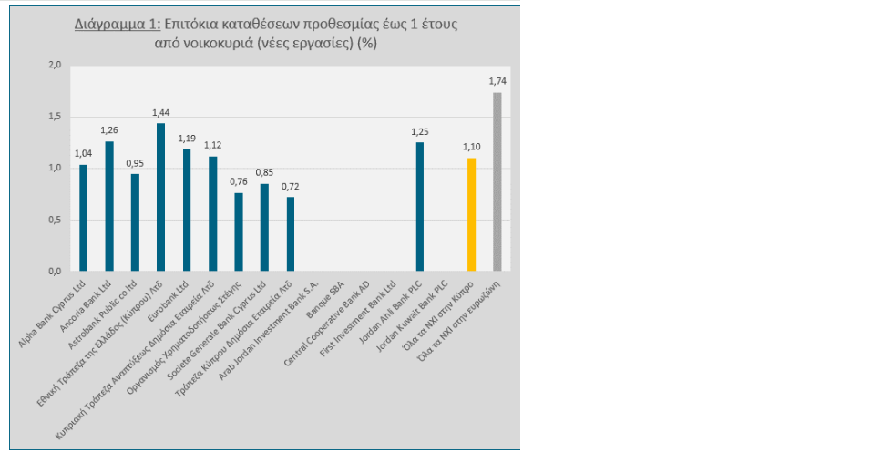 Σε ό,τι αφορά στα επιτόκια καταθέσεων προθεσμίας έως ενός έτους από νοικοκυριά (νέες εργασίες) ο μέσος όρος όλων των νομισματικών χρηματοοικονομικών ιδρυμάτων (ΝΧΙ) στην Κύπρο ήταν 1,10%, ενώ όλα τα ΝΧΙ στην ευρωζώνη ήταν 1,74%.