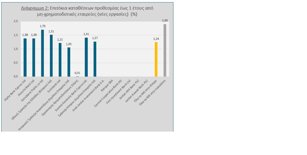 Τα επιτόκια καταθέσεων προθεσμίας έως ενός έτους από μη χρηματοδοτικές εταιρείες (νέες εργασίες) ήταν στην Κύπρο 1,24% ενώ στην ευρωζώνη 1,90%.