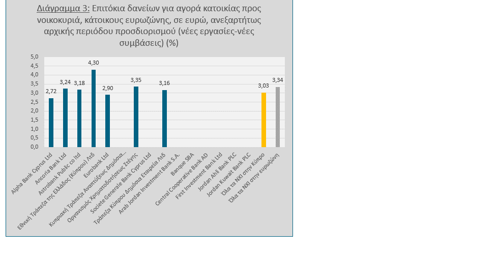 Αναφορικά με τα επιτόκια δανείων για αγορά κατοικίας προς νοικοκυριά, κάτοικους ευρωζώνης, σε ευρώ, ανεξαρτήτως αρχικής περιόδου προσδιορισμού, (νέες εργασίες - νέες συμβάσεις) ήταν 3,03% στην Κύπρο και 3,34% στην ευρωζώνη.