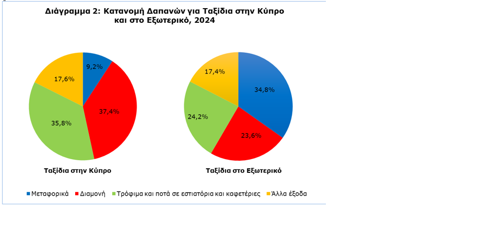 Όσον αφορά τις δαπάνες για τα ταξίδια εντός Κύπρου ανήλθαν στα €300,1 εκατ. το 2024, σημειώνοντας αύξηση 2,5% σε σύγκριση με το 2023. Οι δαπάνες διαμονής αποτελούσαν το μεγαλύτερο ποσοστό δαπανών για τα ταξίδια εντός Κύπρου (37,4%), ενώ οι δαπάνες σε τρόφιμα και ποτά σε εστιατόρια και καφετέριες κατείχαν ποσοστό 35,8%. Οι δαπάνες σε μεταφορικά αποτελούσαν ποσοστό 9,2% των συνολικών δαπανών και τα άλλα έξοδα 17,6%.