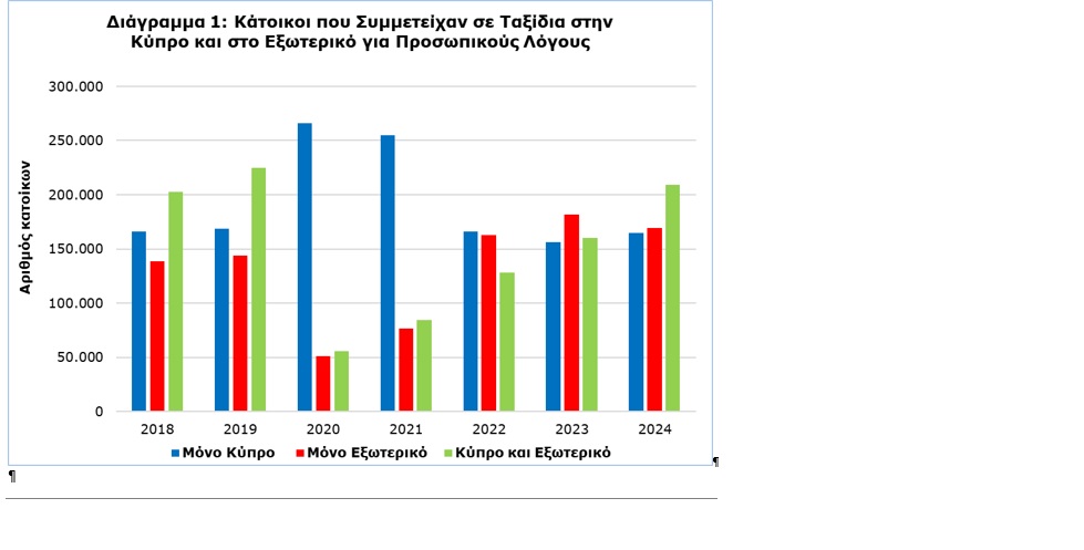 Κατά το 2024, 543.526 κάτοικοι Κύπρου πραγματοποίησαν τουλάχιστον ένα ταξίδι με διανυκτέρευση εντός ή/και εκτός Κύπρου για προσωπικούς λόγους, παρουσιάζοντας αύξηση 9,1% σε σύγκριση με το 2023, κατά το οποίο ταξίδεψαν συνολικά 498.026 άτομα.