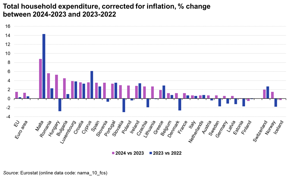 Το 2024, οι καταναλωτικές δαπάνες των νοικοκυριών στην ΕΕ, διορθωμένες για τον πληθωρισμό, αυξήθηκαν κατά 1,5% σε σύγκριση με το 2023. Αυτή η αύξηση ήταν ισχυρότερη από ό,τι το 2023, όταν η ανάπτυξη διαμορφώθηκε στο 0,3%. Στην ευρωζώνη η αύξηση ανήλθε στο 1,3% από 0,5% το 2023.