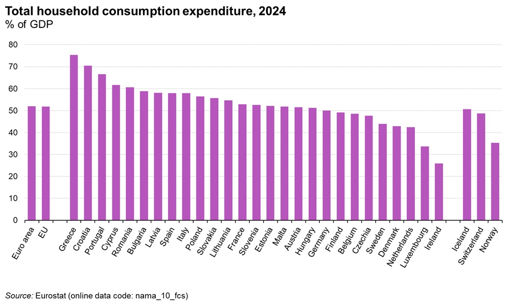 Όσον αφορά τη συνολική καταναλωτική δαπάνη των νοικοκυριών, ως ποσοστό του ΑΕΠ φθάνει το 61,6% στην Κύπρο και είναι η τέταρτη ψηλότερη στην ΕΕ μετά την Ελλάδα (75,3%), Κροατία (70,5%) και Πορτογαλία (6,6%).