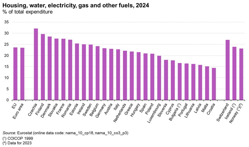 Οι δαπάνες για στέγαση, νερό, ηλεκτρικό ρεύμα, φυσικό αέριο και άλλα καύσιμα, ανήλθε το 2024 στο 17,8% των συνολικών δαπανών των κυπριακών νοικοκυριών έναντι 23,6% στην ΕΕ και 23,5% στην ευρωζώνη.