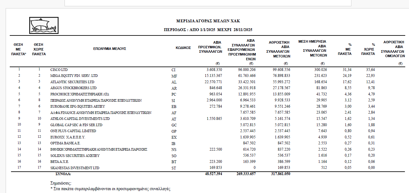 Τις συναλλαγές διαχειρίστηκαν 17 χρηματιστηριακά γραφεία-μέλη του ΧΑΚ.